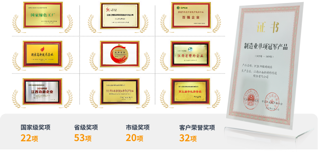 江南新材深耕電子信息銅基新材料領域,憑借持續(xù)的努力與投入,在技術研發(fā)方面收獲頗豐,公司累計獲得16項發(fā)明專利、78項實用新型專利和1項外觀設計專利。目前,榮獲國家級制造業(yè)單項冠軍企業(yè)、國家專精特新“小巨人”企業(yè)、國家高新技術企業(yè)、國家級綠色工廠等榮譽。
