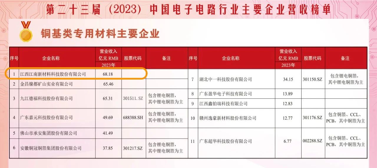 11月6日,2024電子半導體產業(yè)創(chuàng)新發(fā)展大會暨國際電子電路(大灣區(qū))展覽會在深圳會展中心(寶安)盛大開幕,江南新材再次榮獲第二十三屆(2023)中國電子電路行業(yè)主要企業(yè)——“銅基類專用材料主要企業(yè)第1名”。