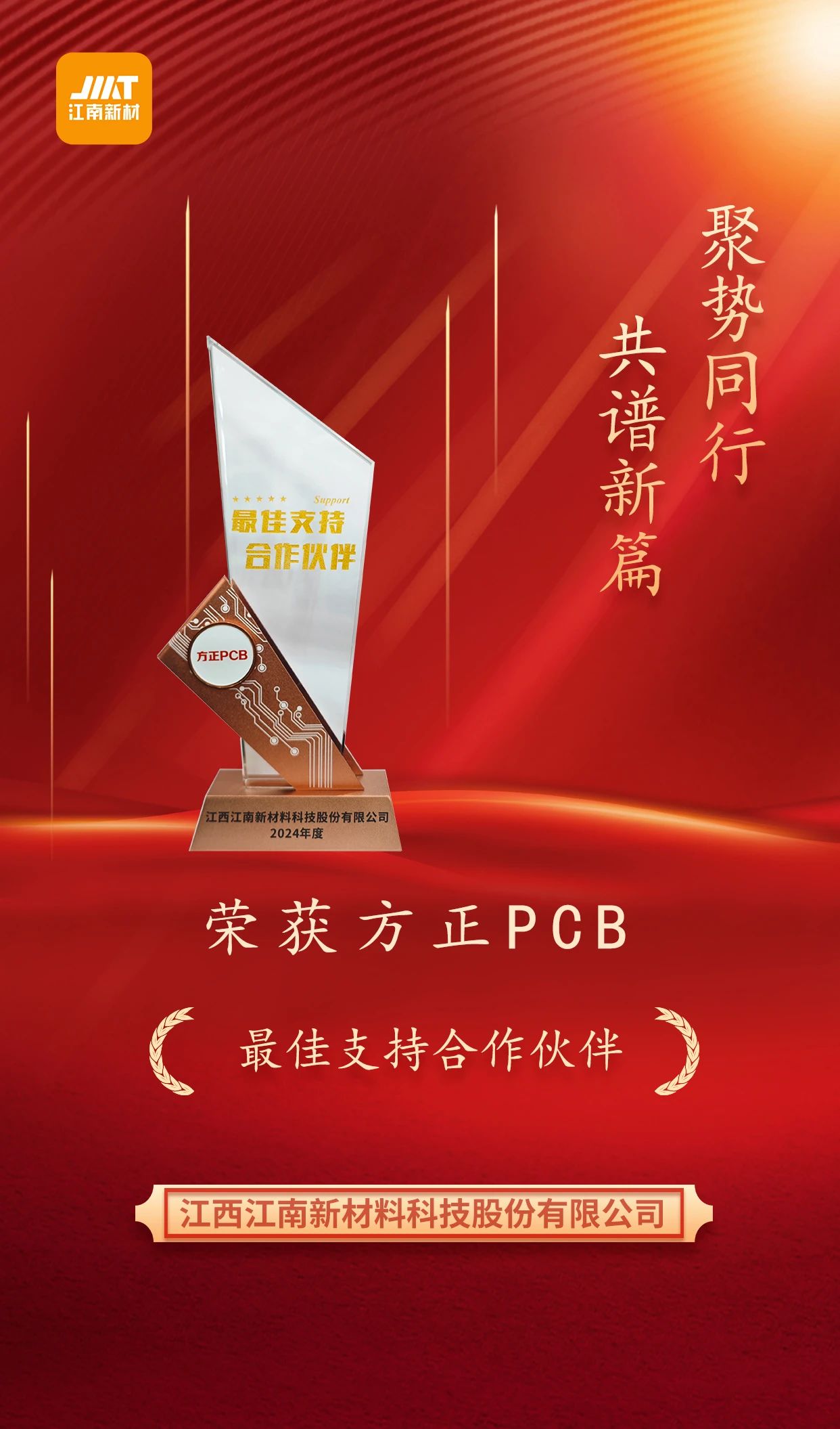 會上,表彰并鼓勵優(yōu)秀的供應鏈合作伙伴,江南新材憑借卓越的品質與合作表現(xiàn)榮獲了方正PCB授予的“最佳支持合作伙伴”獎。
