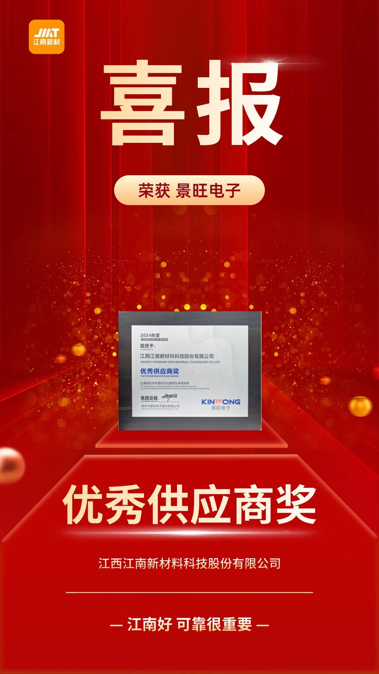 近日,江南新材憑借對(duì)品質(zhì)的堅(jiān)守、對(duì)創(chuàng)新的執(zhí)著及多方位的客戶(hù)服務(wù)支持體系,榮獲了景旺電子2024年度優(yōu)秀供應(yīng)商獎(jiǎng)。
